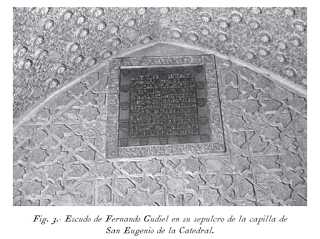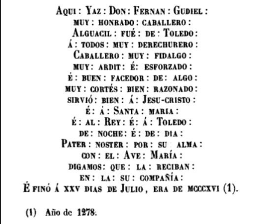 «Aquí yaz don Fernán Gudiel, muy honrado caballero, alguacil fue de Toledo… Finalmente el cuarto epitafio, perteneciente al segundo Fernan Gudiel, muerto en 1332, nos informa de que fue «hijo de don Fernán Gudiel, alguacil mayor que fue de Toledo»