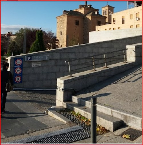 A nuestra izquierda aparte de la calle en cuesta y del muro que rodea el edificio descubrimos que éste cuenta con un patio o aparcamiento privado, con una estatua en la esquina, parece una mujer o un ángel ofreciendo una espada. Esta fachada de edificio también es ventanas pequeñas y no se ve que haya ninguna puerta de acceso. La puerta principal del edificio es la que ésta en la fachada que da a esta calle, con el pórtico, los arcos y los escalones de piedra, pero que da la impresión de estar cerrada, porque a la biblioteca que accede por una pequeña junto a la base del torreón, en el primero de los arcos. Por lo cual, le da sensación de que en conjunto es un edificio que no se aprovecha lo suficiente. Demasiado grande para la biblioteca y, sobre todo, me sorprende que la hayan puesto en la última planta, cuando lo lógico y más accesible sería que estuviera menos escondida, aunque, si es por el tema de la iluminación, sin duda en las últimas plantas los ventanales con más grandes.