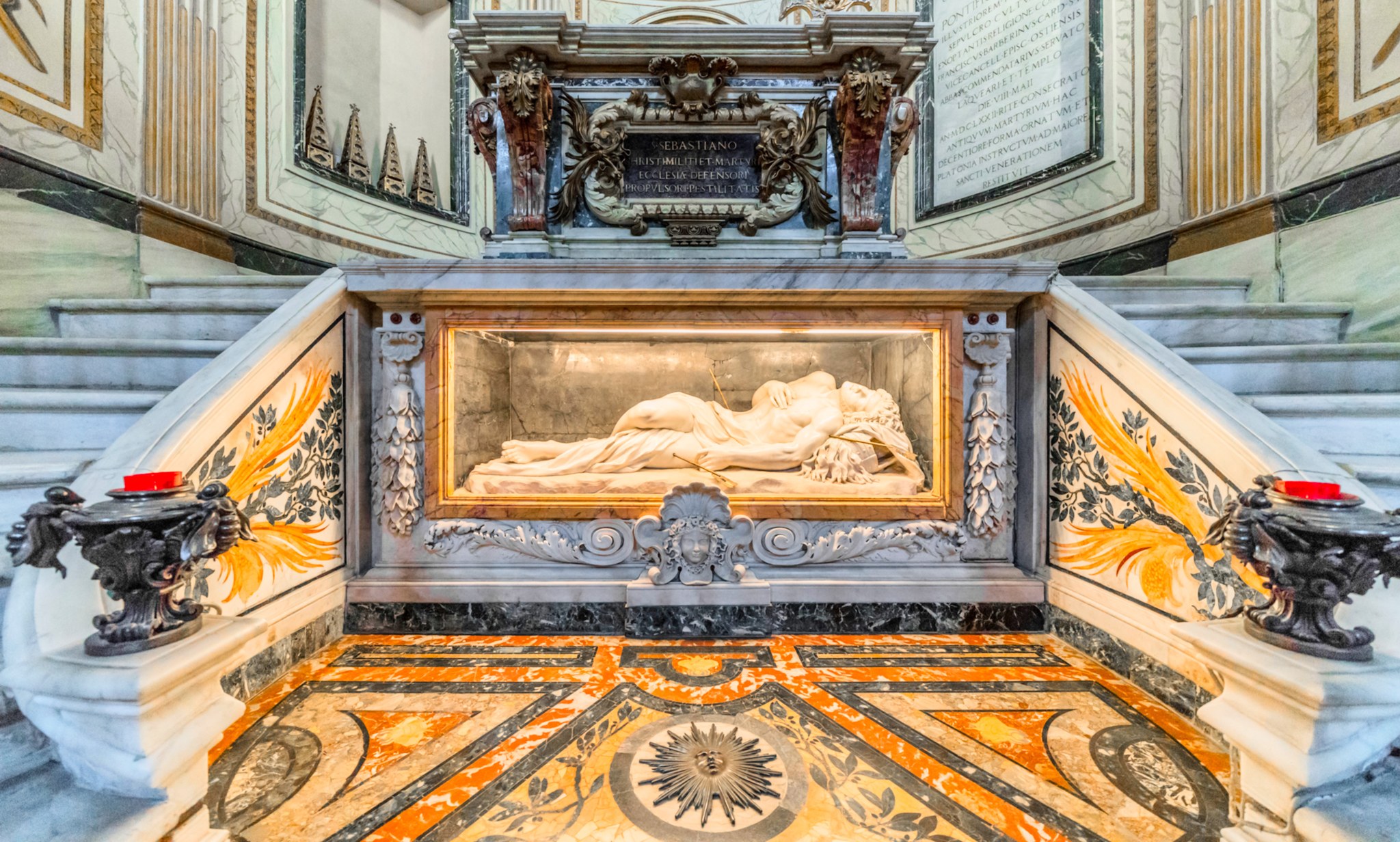 El Papa Eugenio II, el día 9 de diciembre del 826 le envía reliquias a San Medardo de Soissons; Gregorio IV, que le sucedió como Papa, puso su cabeza en el oratorio de San Gregorio en el Vaticano. Este relicario del cráneo de San Sebastián, lo llevó más tarde el Papa San León IV a la iglesia romana de los Cuatro Santos Coronados, donde actualmente es venerado. En el Vaticano existieron otras reliquias del santo, pero en el año 1218, el Papa Honorio III se las dio a los cistercienses, que eran los custodios de la Basílica romana de San Sebastián y allí están.