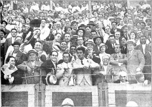 En agosto de 1930 cuatro estrellas de Hollywood pasaron sus vacaciones en España y la prensa de la época cubrió ampliamente su viaje. Se trataba de Buster Keaton (conocido como «Pamplinas» en España) su esposa Norma Talmadge y sus cuñados Natalia Talmadge y Gilbert Roland. La tarde del 19 de agosto, tras visitar el Monasterio del Escorial por la mañana con sus parejas, Buster Keaton (marcado con un 1 en la foto) y Gilbert Roland (2) acudieron a Toledo para presenciar una corrida de toros. El marcado con el número 3 es el periodista, Sr. Mantilla, que cubrió su viaje a Toledo.