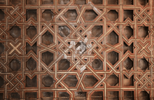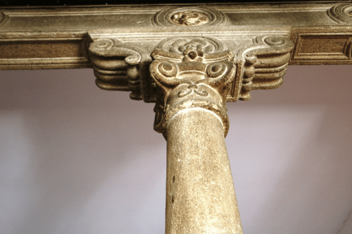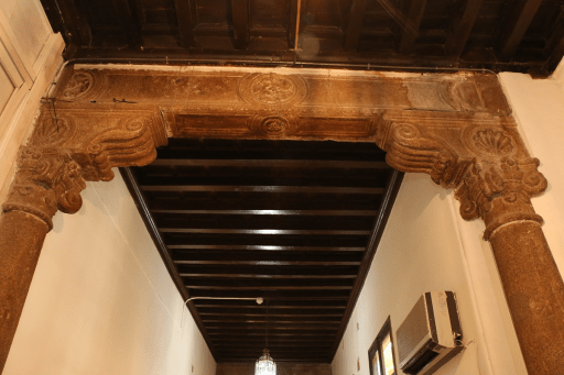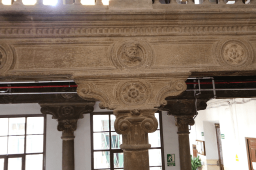 Parte superior del patio renacentista. La decoración que aparece en ella imita un edificio greco-romano, formado por un friso decorado con tondos de rosáceas, rostros de estética clásica (cabezas covarrubiescas) y una cornisa con ménsulas, elementos todos ellos de orden clásico.