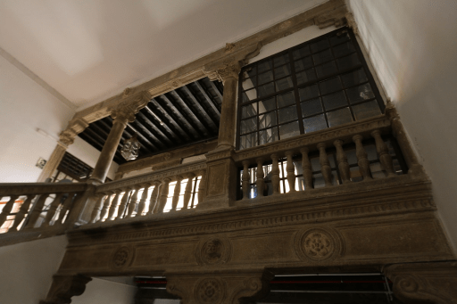 A la izquierda del patio se desarrolla una gran escalera claustral, que no se halla en contacto directo con el patio, ya que éste está rodeado de una crujía que conserva todavía, en algunos sitios, unas columnas sosteniendo un dintel, decorado con las misas rosetas que las del patio, y una pequeña cornisa de piedra, en la parte superior del muro, que nos indica cómo el tamaño de las antiguas crujías se corresponde con el actual.