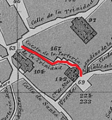 Se llamaba Cuesta de la Portería de la Trinidad porque en ella se situaba la portería del convento de Trinitarios Calzados, que dejó de serlo hacia 1836 para albergar entre otras cosas un cuartel. Para hacernos una idea del ambiente que generaba su estrechura nada mejor que leer este extracto de la genial novela de Benito Pérez Galdós titulada Ángel Guerra, escrita hacia 1890.