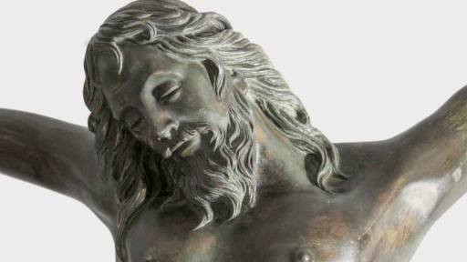 La peana, con una pátina verde oscuro, se ha construido con planchas de latón plegadas y soldadas. El autor señaló en su día que «la iconografía de la escultura hace referencia al círculo, que simboliza el nacimiento, muerte y resurrección de Jesucristo para salvarnos y regalarnos la vida eterna».