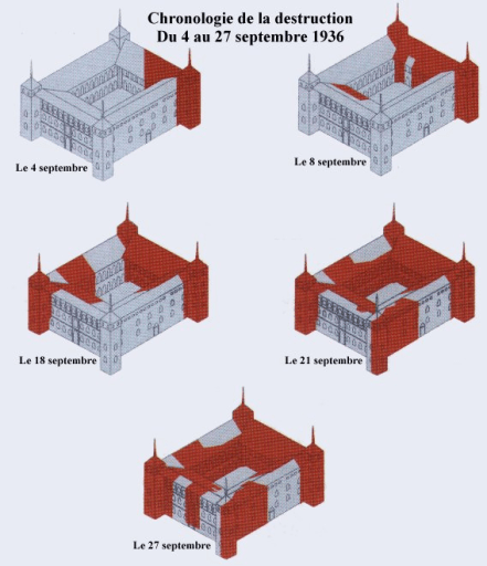 «Las gestiones para lograr la rendición de los sitiados, o al menos la evacuación de mujeres y niños habían sido infructuosas, el Ejército Expedicionario de Varela avanzaba por el Tajo… el viernes 18 de septiembre de 1936, tras media hora de bombardeo artillero, a las 6:31 de la mañana una mano desconocida activó el mecanismo eléctrico que produjo la explosión junto a los sótanos del Alcázar de dos minas cargadas con aproximadamente 2.500 kilos de trilita cada una de ellas», añade el autor español en su obra.