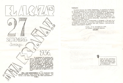 Último número del diario mimeografiado ‘El Alcázar’ editado durante el asedio. Lo acompaña la reproducción de las octavillas que se lanzaron al exterior del Alcázar el 27 de septiembre: «para conocimiento del enemigo contendiente».
