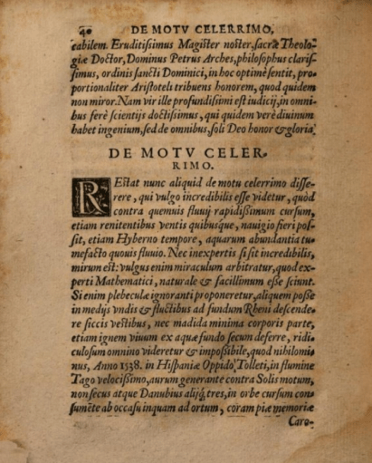 «Anno 1538. in Hispaniae oppido Tolleti, in flumine Tago velocissimo, aurum generante contra solis motum, nos secus atque Danibius alli tres, in orbe cursum consumente ab occasu in quam ad ortum, corampi memoriae // Carolo Quinto Imperatore cum decem propemodem millibus hominum experientia vidi»