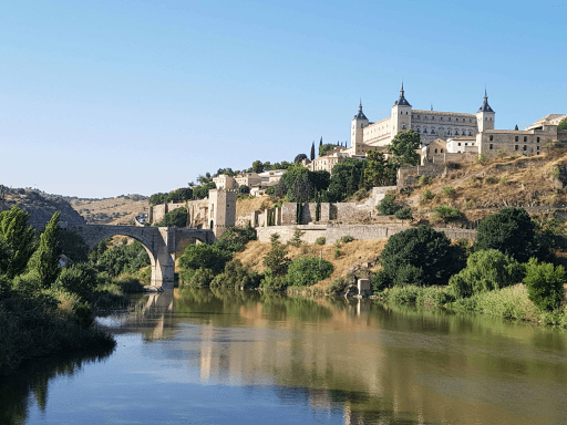 Imagen real y actual de Toledo. Zona de Safont, con el Alcázar y el puente de Alcántara.