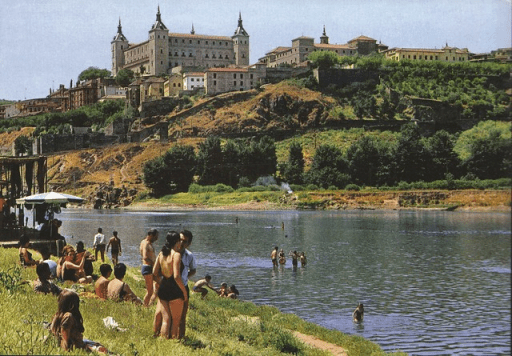 Imagen real. Bañistas en la Playa de Safont bañándose en el río Tajo en Toledo. Años 70s