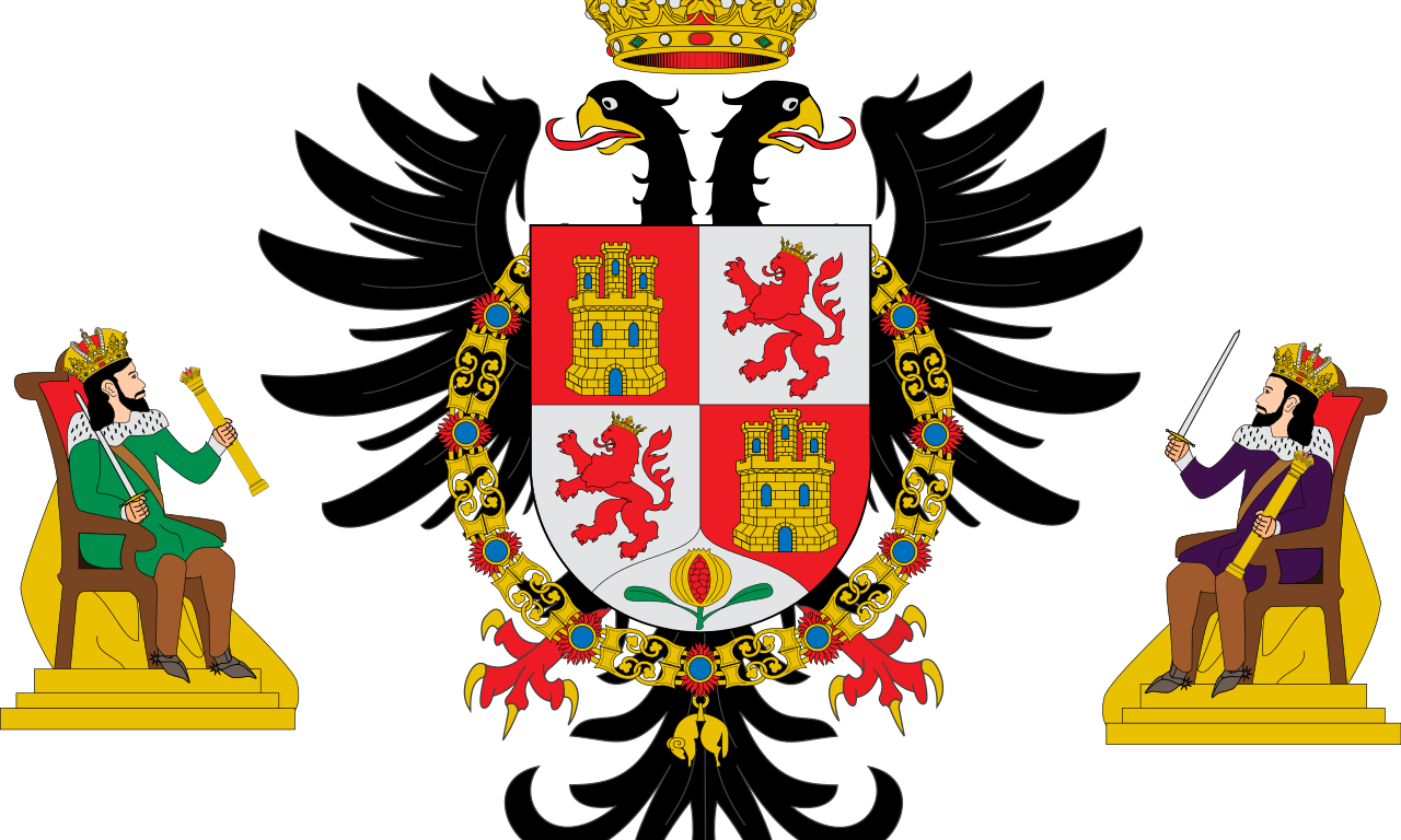 Los reyes sentados que acompañan al águila bicéfala completan las armas de la ciudad, utilizadas con este ordenamiento desde mediados del siglo XVI hasta nuestros días, siendo así admitido por la costumbre y sancionado por un antiguo privilegio de Pedro I dado en las Cortes de Valladolid en 1351, en el que se afirmaba que las armas de Toledo son las del Rey, que en el reinado del Emperador las hizo suyas el Ayuntamiento de la ciudad añadiéndole el elemento diferencia dar del rey sentado en recuerdo de las primitivas y que por motivos de simetría se colocaron dos. A partir del siglo XVI se regularizan y divulgan en sellos, impresos, artes decorativas, etc…