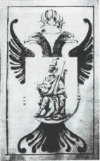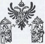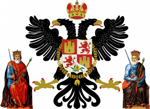 El todo, sobre un águila bicéfala exployada, de sable, con el pico y las garras de gules. éstas armadas de oro. Timbrado de corona imperial de oro.A la derecha e izquierda un emperador sentado en su trono con capa de oro y corona imperial de lo mismo, que sostiene en su mano derecha una espada de plata y en la izquierda un cetro de oro. El resto de su color.