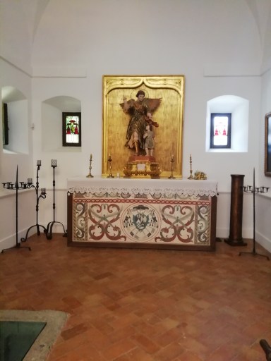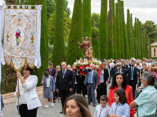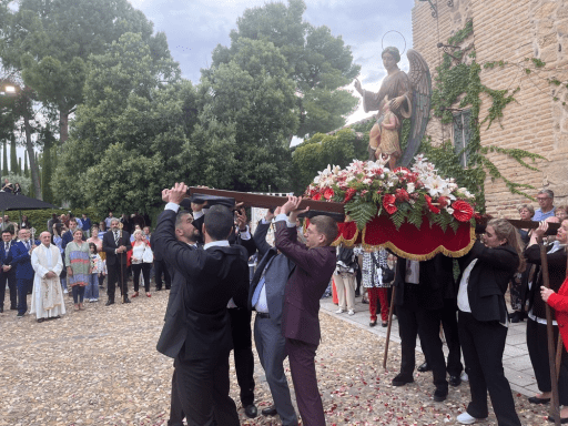 Es al finalizar la tarde cuando los cofrades sacan la imagen del Ángel en procesión, con inicio y final en la ermita y recorrido por todas las instalaciones del Cigarral, por arboledas y paseos florales, patios de origen árabe y fuentes… Uno de los momentos más emotivos tiene lugar a la finalización del acto, en el que los costaleros bailan al Ángel al son del himno nacional mientras los fieles lanzan pétalos de rosa.