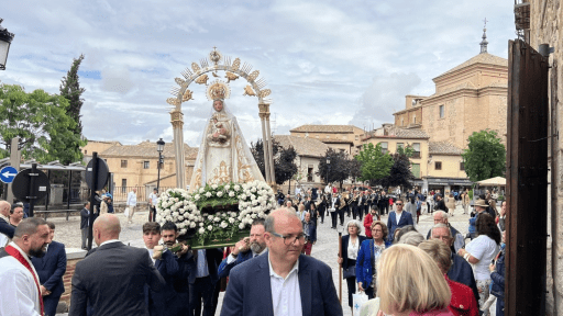 Bajo los acordes del himno de España interpretado por la banda de música Benquerencia, la Virgen de Monte-Sión salió de la iglesia de Santo Tomé y volvió a recorrer las calles de la Judería toledana ante la atenta mirada de toledanos y turistas.