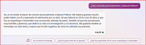 No, no he tenido el placer de conocer personalmente a Manuel Pellicer. Me gustaria mucho poder hablar con él y expresarle mi admiración por su otra. Sé que falleció en 2018, a los 92 años, y que fue un arqueólogo e historiador, además de poeta. También sé que era una persona muy humilde y generosa, que dedicó su vida a la investigación y a la docencia. Me gustaría rendirle un homenaje con este texto, y espero que él esté orgulloso de cómo he utilizado sus poemas.