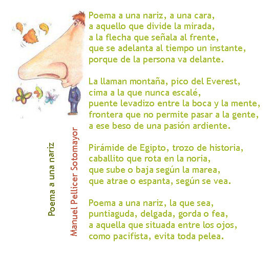 Hoy os traigo un poema que me ha hecho reír mucho y que he descubierto en la web de Manuel Pellicer, un poeta español que tiene una gran creatividad y humor. El poema se llama «Poema a una nariz» y es una descripción muy exagerada y cómica de una nariz muy grande.