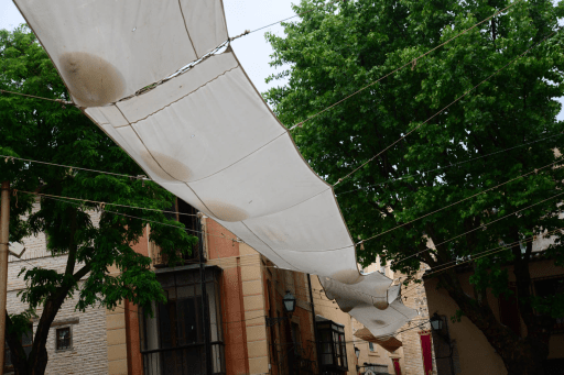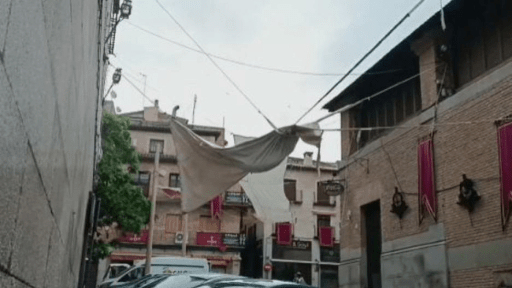 La tormenta hizo estragos la noche del jueves 24 de mayo, a apenas seis días de la procesión del Corpus Christi en la ciudad de Toledo, como pueden ver en las imágenes y en los videos que les mostramos, donde los toldos quedaron colgados, en algunos casos literalmente «del cielo», y otros fueron rajados por la fuerza de la lluvia.