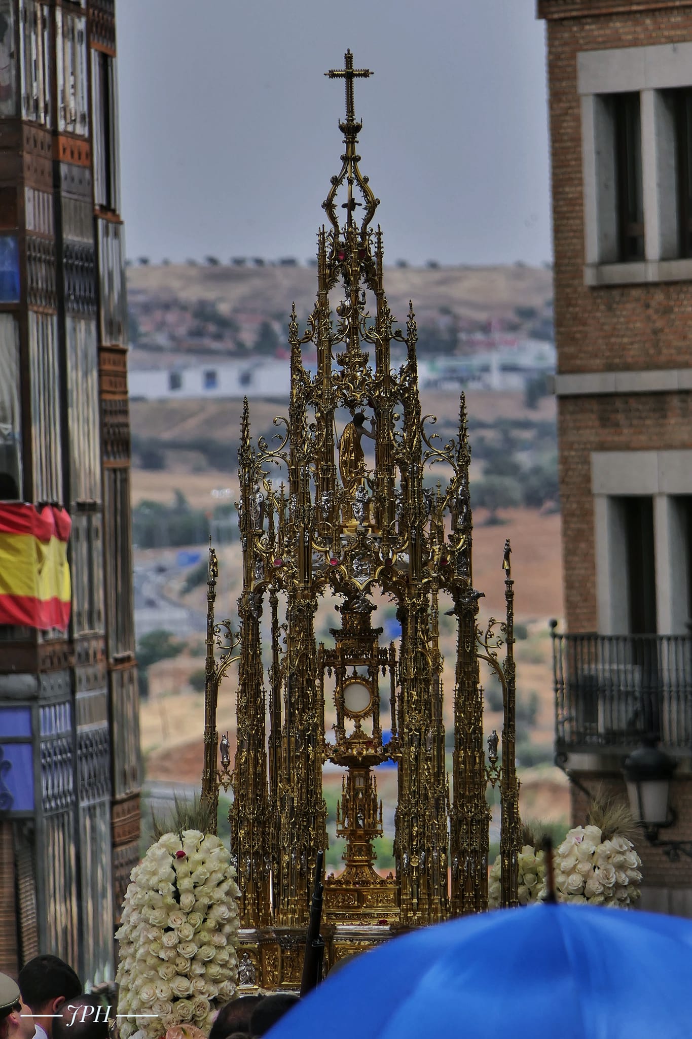 Balsas de agua cubrían los toldos a primeras horas de la mañana y cientos de personas, pertrechadas con paraguas, buscaban los mejores sitios para disfrutar del recorrido. El tomillo tenía un sonido distinto empapado de agua… La última vez que llovía en el Corpus de Toledo fue en 2008.