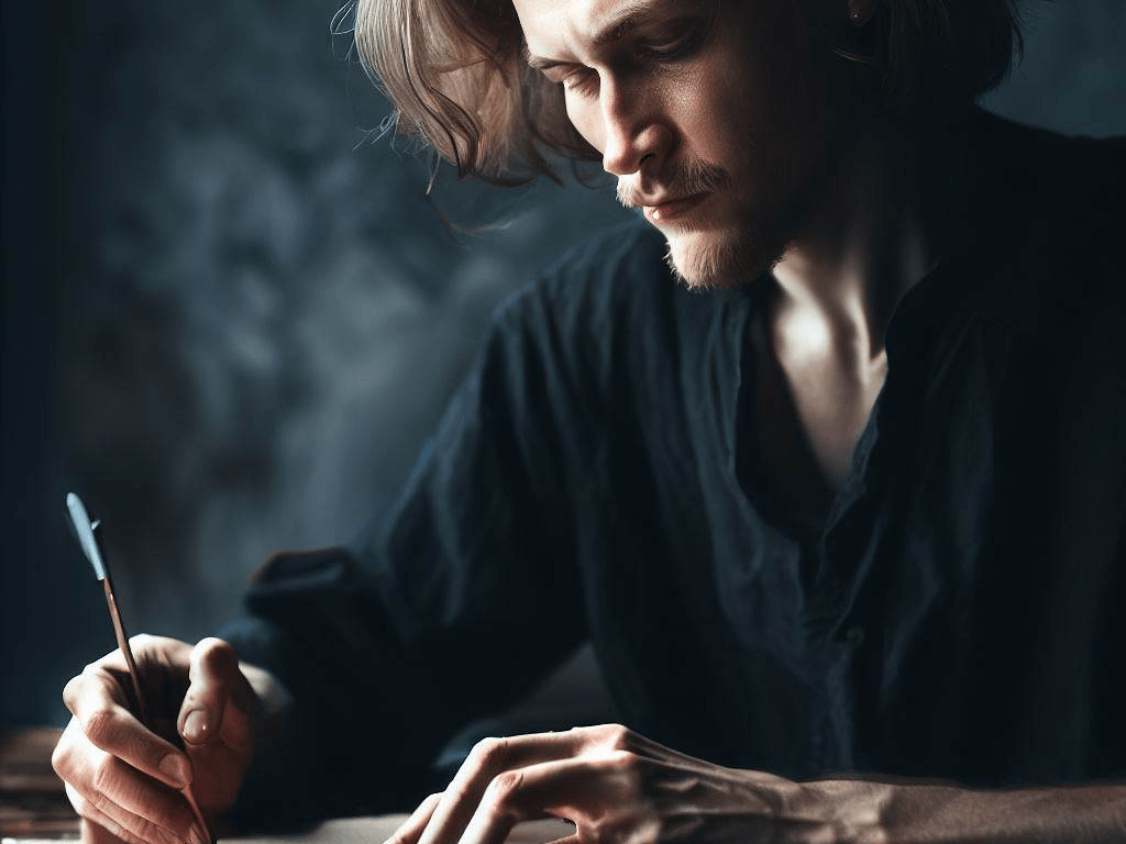 Su mirada, profunda como el mar en calma, refleja la pasión y el anhelo de aquel que ha navegado por los océanos de la imaginación. Sus ojos, portadores de un brillo misterioso, son ventanas abiertas al mundo de la creación.