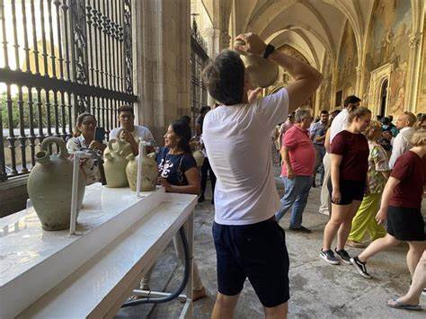 La tradición centenaria de «beber agua de la Virgen» regresa, ya con total normalidad, tras cuatro años limitada por la pandemia. En concreto, este año se han dispuesto 34 botijos de barro en el claustro de la Catedral Primada que se rellenan constantemente con agua del aljibe.