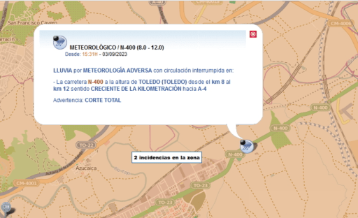 La DGT advierte que la circulación ha tenido que ser cortada del kilómetro 8 al 12 debido a las circunstancias adversas para el tráfico debido al intenso aguacero que cae desde el mediodía. También ha sido cortada la TO-22 a la altura de Mocejón