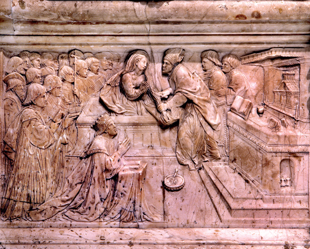 En torno al sagrario dispone hermosos relieves de la Anunciación, Visitación, Natividad, aparición de Santa Leocadia y Predicación de San Ildefonso. Bigarni se inspira en el retablo de la Cartuja de Miraflores, de Gil de Siloe. Una genialidad del maestro se manifiesta en trasladar al alabastro el torno giratorio que Siloe hizo en madera.