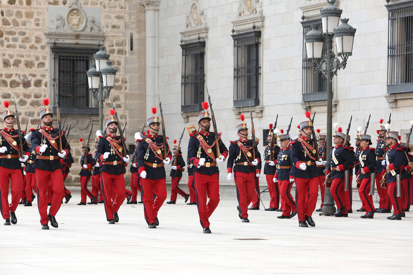 La guardia entrante partirá desde la Plaza de Zocodover y accederá desfilando a la explanada norte del Alcázar, donde se situará enfrente de la guardia saliente. A continuación, se procederá al izado de la bandera nacional y se rendirá homenaje a los que dieron su vida por España.
