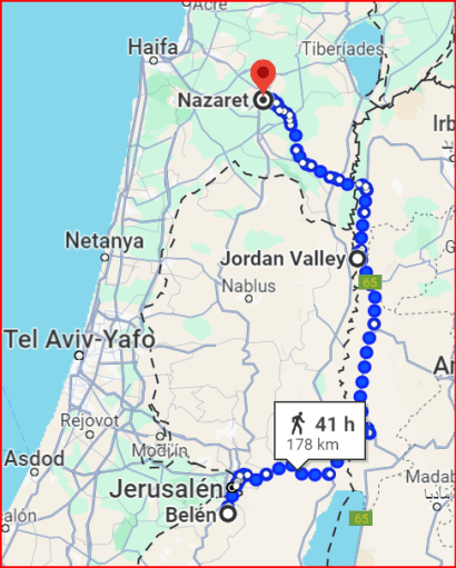 Si salieron de Nazareth, en Galilea, y tomaron la ruta del valle del Jordán, siguiendo el curso del río hacia el sur, será un camino largo, pero más seguro y llano que el de las montañas.