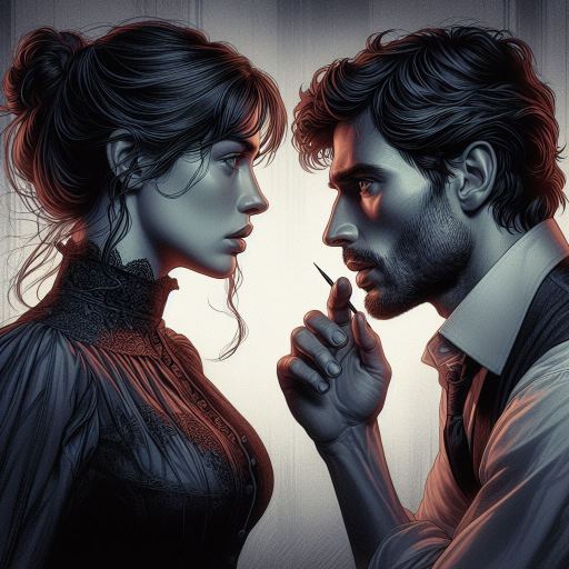 Una imagen ilustrativa para la entrevista a Manuel, el protagonista de la novela ‘Silencio en tus labios’. La imagen debe mostrar a Manuel y a Ana, los dos personajes principales, en un momento de tensión, conflicto o pasión. La imagen debe transmitir el tono de la novela, que es intenso, profundo y dramático. La imagen debe tener un estilo realista, con colores oscuros y contrastes fuertes. La imagen debe tener un tamaño adecuado para acompañar a la entrevista en un blog o una revista.
