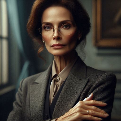Victoria, la madre de Ana en la novela “Silencio en tus labios”, podría llevar gafas. Las gafas añadirían un toque de seriedad y distinción a su apariencia. Además, podríamos imaginar que lleva un collar o broche clásico como accesorio, que refleje su posición como mujer de negocios y su actitud protectora hacia su familia.