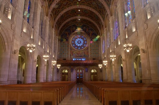 Catedral católica de Nuestra Señora Reina del Santísimo Rosario en Toledo de Ohio. (Our Lady Queen of the Most Holy Rosary Cathedral) De planta basilical, se construyó entre 1925 y 1931 según el proyecto del arquitecto William Perry. En ella se incluiría una piedra regalada por la Primada de Toledo en 1934 como símbolo de hermandad (fotografía de Wikipedia)