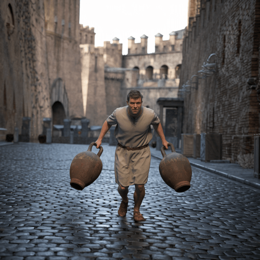 Gaius: [sacude la cabeza con frustración] Depende, pero en los días buenos, me lleva cerca de una hora ir y volver. El río está allá abajo, y los caminos son estrechos y traicioneros. Cuando hace calor, es aún peor. Y no olvides que esto es solo para mi familia, ni hablar de los comerciantes, las termas, o las fuentes públicas. ¡Estamos desesperados!