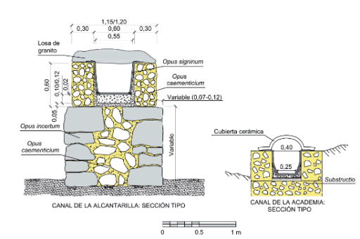b) Canal o specum, con una ligera inclinación en su recorrido, que discurría unas veces enterrado y otras sobre arcadas para salvar los desniveles existentes. El recorrido del canal sería de 38 kms. hasta llegar al borde del río Tajo, cuyo desnivel salvaba mediante un acueducto. Las fuertes pendientes se solucionaban mediante torres acuáticas, donde el agua caía entre dos depósitos para recuperar después una pendiente regular.