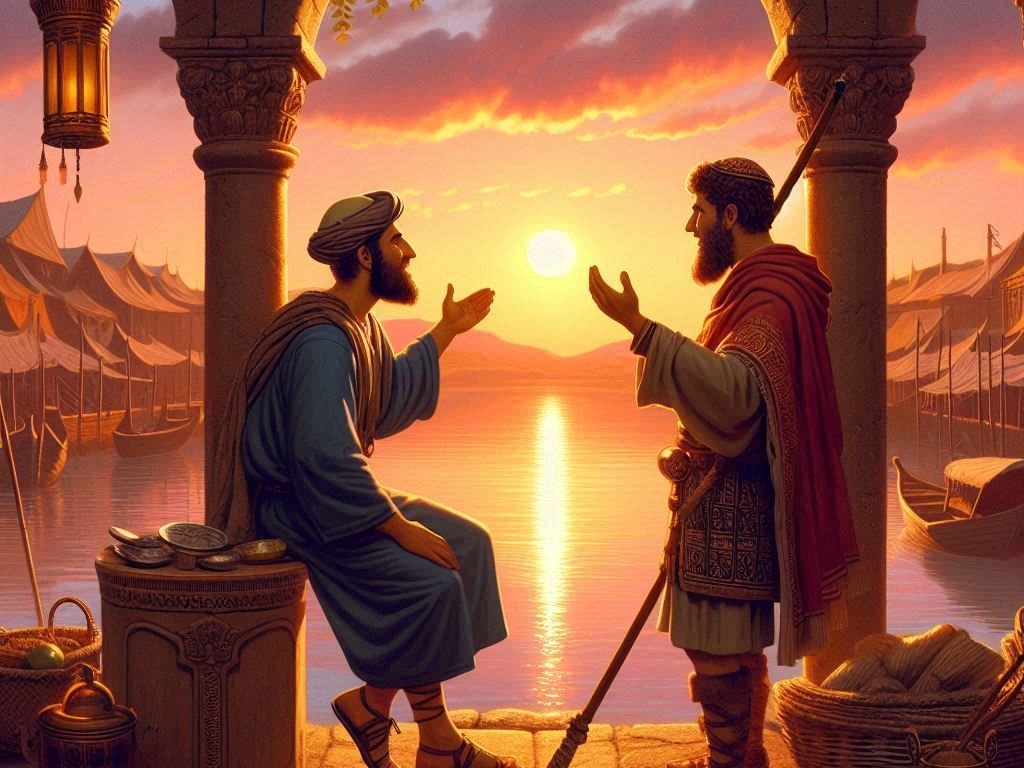 [Escenario: Un tranquilo atardecer junto al río Tajo, en el mercado de Toletum. Un judío, Simón, y un carpetano, Brigo, están compartiendo una conversación amistosa después de intercambiar productos. Ambos muestran respeto mutuo mientras hablan de sus creencias.]