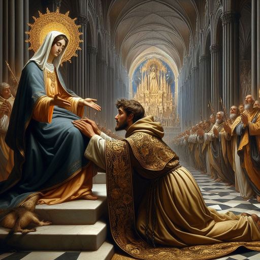 Uno de los aspectos más singulares de la vida de San Ildefonso fue su devoción a la Virgen María, la cual alcanzó su punto culminante en un extraordinario encuentro místico. Según la tradición, en una ocasión, Ildefonso fue visitado por la propia Virgen María, quien, en un acto de profunda humildad y amor, le impuso una casulla celestial como señal de su protección y favor. Este hecho no solo consolidó la relación entre Ildefonso y María, sino que se convirtió en uno de los momentos más emblemáticos de la historia mariana.