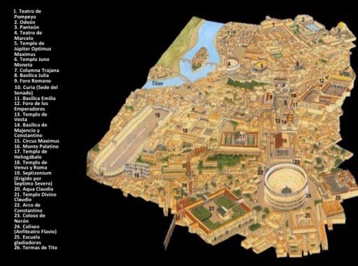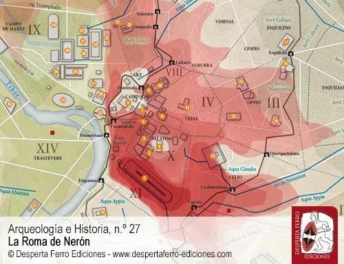 Un mapa a doble página de la ciudad de Roma en tiempos de Nerón nos ilustra acerca de cómo este gran incendio, que ardió durante nueve días, se extendió por la ciudad y destruyó buena parte de sus excelsos monumentos.