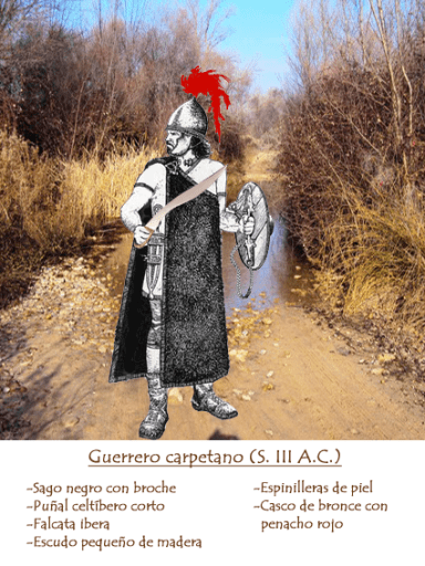 El soldado de infantería carpetano vestía ropajes negros u oscuros de lana, cubiertos por el sagum (de donde deriva la palabra castellana sayo), que era una especie de manto rectangular de lana que no pasaba de las rodillas y se ponía encima de los demás vestidos ajustándose por medio de un broche.