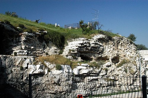 Vista de la Puerta del León desde la cima del monte considerado por algunos como el Gólgota. Esta es la localización de la primitiva Puerta del Cordero, cerca de los cuarteles romanos de Jerusalén.