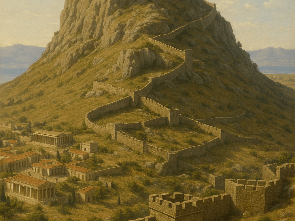 Hoy nos trasladamos a las alturas sagradas del mundo helénico, donde la piedra, el mito y la estrategia se entrelazan: el majestuoso Acrocorinto, guardián eterno de la ciudad de Corinto.