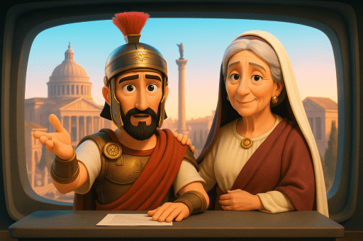 Presentador (voz solemne y profesional): Salve, ciudadanos del Imperio. Les habla Lucius Valerius, presentador de ACTA DIURNA, el noticiario más confiable del Imperio Romano y les saludo con noticias frescas de la cosmopolita ciudad de Corinto. En esta edición especial desde los estudios de Roma, año 747 ab urbe condita — o como dicen algunos, el año 7 antes de la nacencia de cierto niño que algunos en Judea esperan como Mesías…