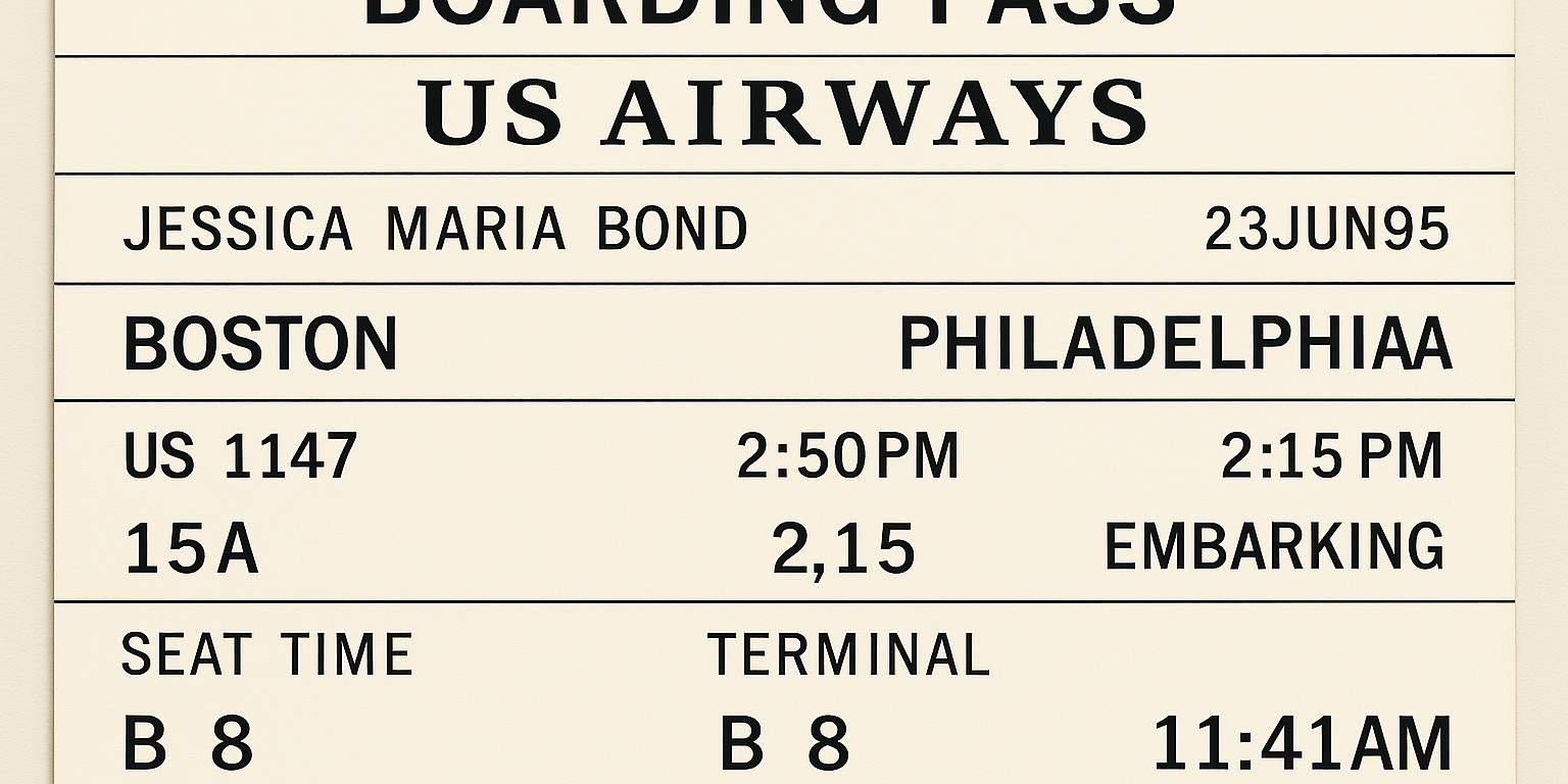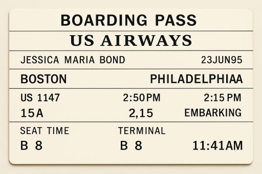 Esta primera tarjeta de embarque sí le permite que la tenga, que la maneje con total libertad, que se la quede, que la guarde como un recuerdo de este viaje, del hecho de que es la primera vez que se aleja del que ha sido su entorno y su mundo, como premio a esta valentía impuesta. Proximo destino: Philadelphia Airport