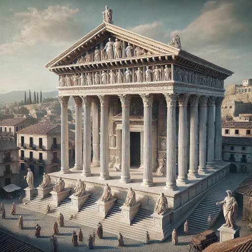 ¡Ah, el foro! Aquí se cruzan el Cardo y el Decumanus Maximus, y aquí se cruzan también nuestras vidas. Es una plaza amplia, adornada con estatuas de bronce: Augusto preside, por supuesto, pero también hay una de Flavia Carpetana, matrona local que donó una fuente pública. El templum Capitolium, aún humeante por los sacrificios matutinos, domina el extremo norte. En el lado oriental, se alza la Basílica, donde se resuelven pleitos y se pactan alianzas.
