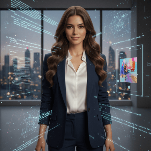 Prompt: «Una mujer alta y delgada, Jessica Marie Bond, con largo cabello castaño y ojos marrones profundos, viste un elegante blazer azul marino y una blusa de seda blanca. Su postura es segura y reflexiva, con un toque de ingenio en su expresión. Está en un entorno minimalista y moderno, quizás una oficina con grandes ventanales que dan a una ciudad, simbolizando su perspectiva analítica y su independencia. La luz es suave pero definida, resaltando su determinación. Estilo profesional, fotografía de alta resolución.»