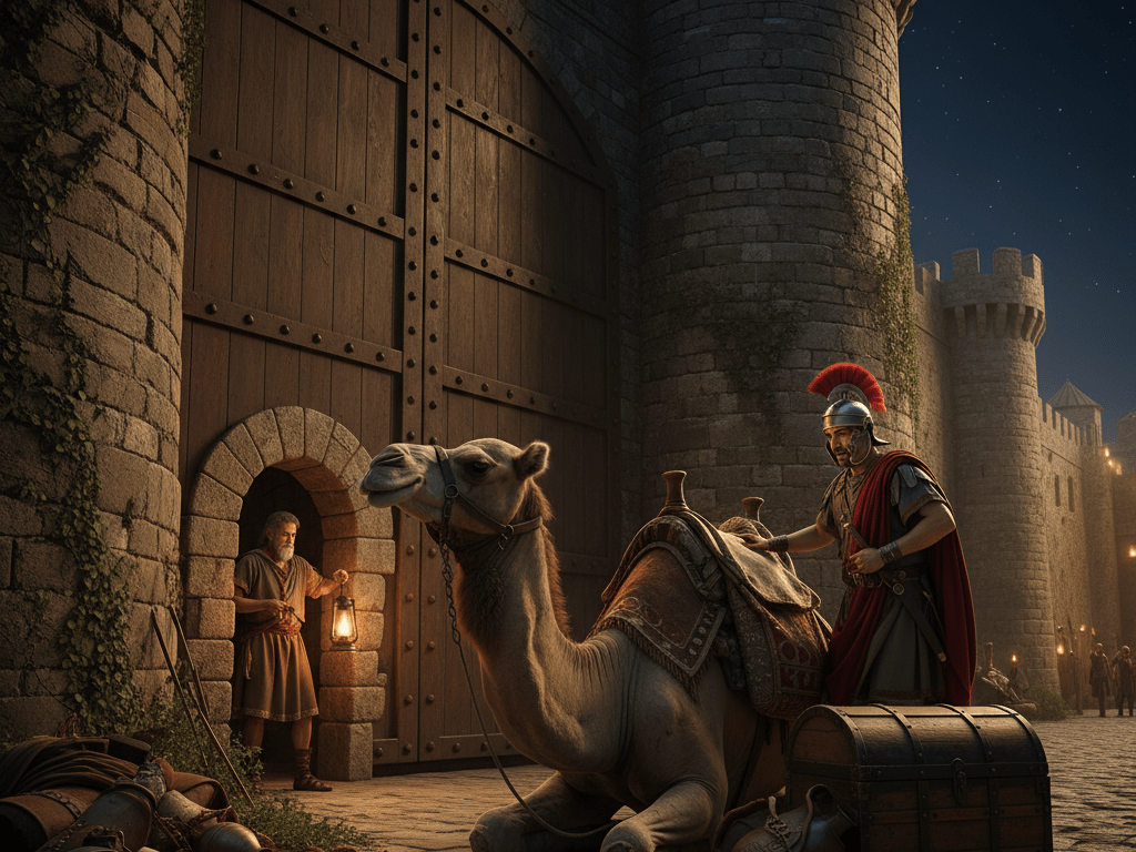 El caso del camello y el «ojo de aguja» se ha convertido en una metáfora para la vida en nuestra nueva y próspera ciudad. Mientras Toletum asciende en gloria y riqueza, su gente aprende que, a veces, para lograr los más grandes objetivos, uno debe dejar atrás las cargas que lo pesan. El decurión Cayo Valerio Cicerón, al dejar su título en la arena para ganar el de municipium para todos, no hizo menos que doblar sus rodillas para que su ciudad pudiera pasar por la puerta de la grandeza.