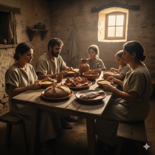 - Personajes: Una familia de tres a cuatro personas (padres e hijos) sentadas en bancos de madera o taburetes alrededor de una mesa rústica. Visten túnicas simples de lino o lana, de colores terrosos. Sus expresiones son de concentración en la comida, con un sentido de gratitud por el sustento.