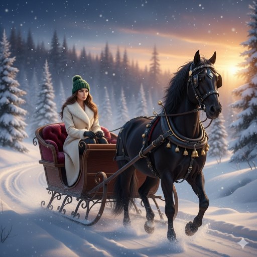 - Sujeto Principal (La Grieta): Un trineo antiguo y abierto de madera (un one-horse open sleigh), abandonado en un rincón cubierto de nieve. Se debe ver que es funcional pero rústico, no un objeto de lujo. El caballo no debe estar presente; solo las huellas de un solo animal que se borran rápidamente en la nieve, enfatizando la ausencia de redundancia.
