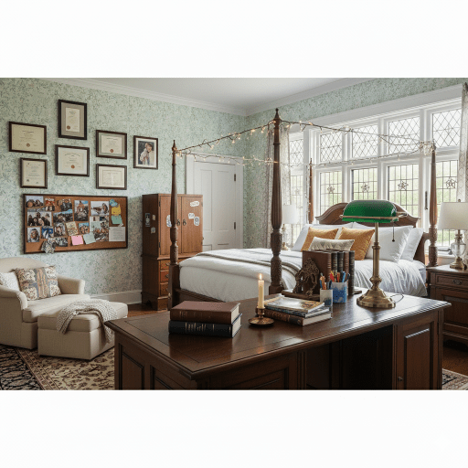 - Toques de su Personalidad: La cama, con un cabecero de madera o tapizado, estaría cubierta con un edredón de diseño clásico pero cómodo. En las paredes, en lugar de un póster de película (que sus padres considerarían «poco generoso»), habría diplomas enmarcados, certificados de logros académicos o deportivos, y quizá un elegante corcho donde cuelga fotos con sus amigas y recortes de revistas, pero siempre con un cierto control.