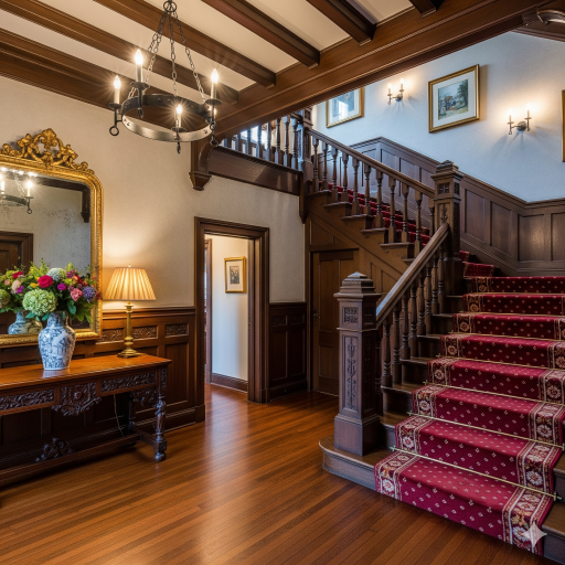 - Madera por Doquier: El vestíbulo se abre a un espacio donde la madera oscura es protagonista. Los suelos son de parquet de roble macizo, brillantes y pulcros, que resuenan suavemente con cada paso. Las paredes a menudo tienen paneles de madera (wainscoting) hasta media altura, o están pintadas en tonos neutros y cálidos (cremas, beiges, verdes suaves) que complementan la madera.