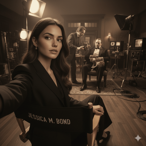 - La Escena: En un set oscuro, con tonos sepia, un influencer de IA con un traje de diseño impecable se sienta en una silla de director con su nombre. Observa con atención cómo Francis Ford Coppola dirige a Marlon Brando en la icónica escena inicial de El Padrino.