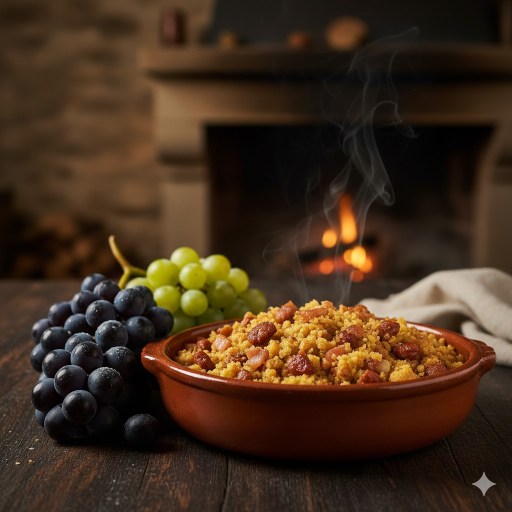 [ ]1 hogaza grande de pan de pueblo (del día anterior, de miga compacta)[ ]200 gr de chorizo para freír de buena calidad, en rodajas[ ]150 gr de panceta curada en dados pequeños[ ]1 cabeza de ajos entera[ ]1 cucharadita de Pimentón de la Vera (mitad dulce, mitad picante)[ ]Aceite de Oliva Virgen Extra (generoso, sin miedo)[ ]1 vaso de agua[ ]Sal[ ]El toque secreto: 50 ml de vino Moscatel o Pedro Ximénez[ ]El toque final: 1 racimo pequeño de uvas blancas sin pepitas