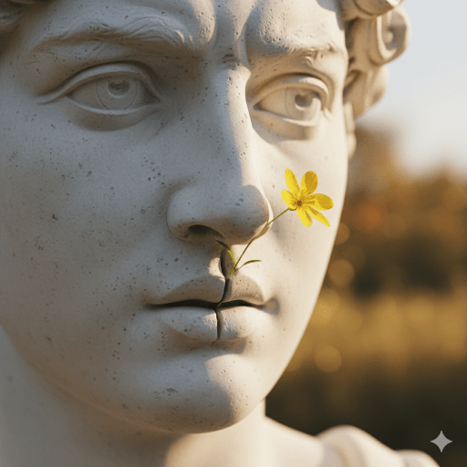 El prompt inicial fue algo así como: ‘Retrato cinematográfico de una escultura de mármol clásica, foco en la nariz, agrietada e imperfecta, con una única flor silvestre creciendo desde la fisura. Luz de la hora dorada. 8k.’ 🤖✨